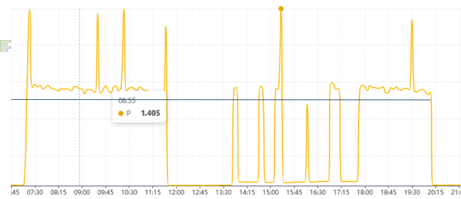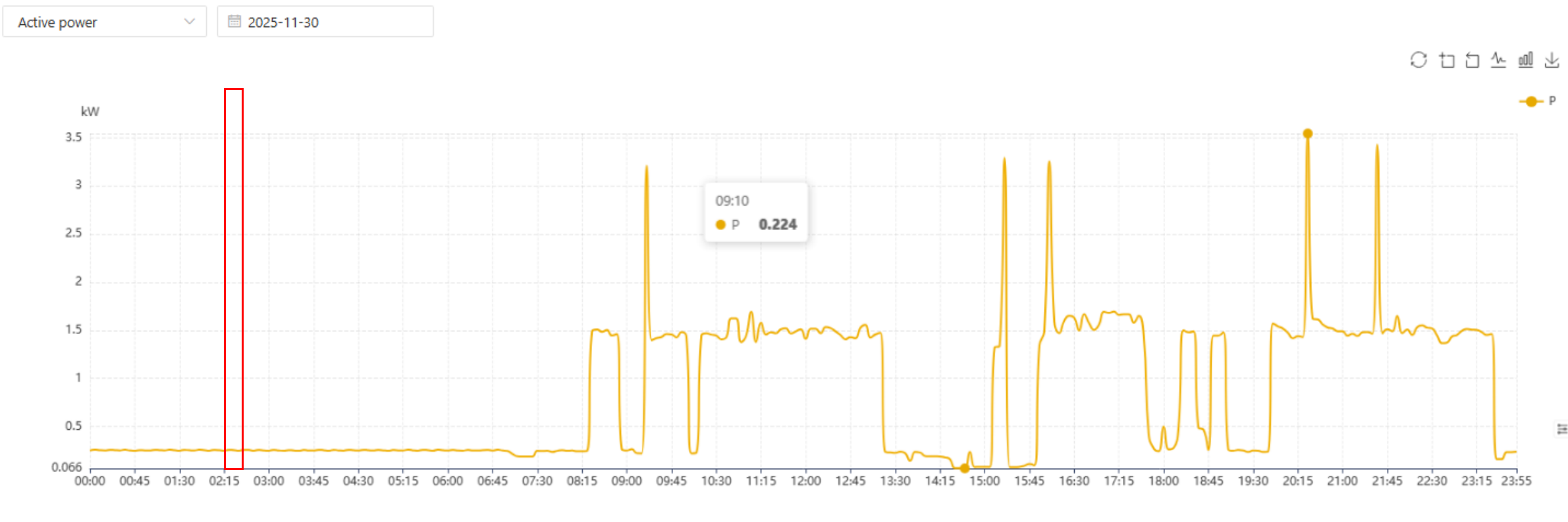 最大需要は、これらの需要間隔内の請求サイクル (通常は 1 か月) 中に記録された最大の平均電力値を表します。標準の間隔は 15 分ですが、これは電力会社や地域によって異なる場合があります。