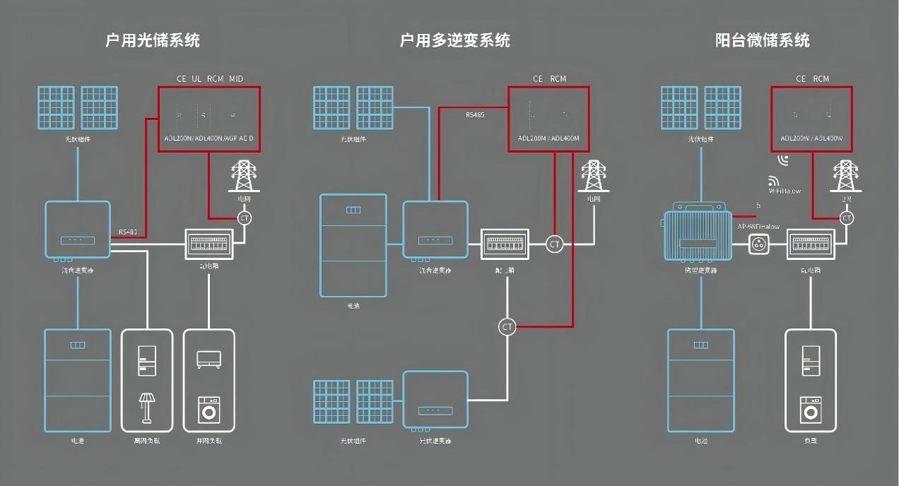 マルチインバータ家庭用システム: 基本的な PV/蓄電システムの下に、追加の PV/蓄電システムを改造してマルチインバータ構成を作成します。 ADL メーターは、元の PV 発電とグリッド接続ポイントの電流を監視することでメインのハイブリッド インバーターと相互作用し、逆流防止監視機能を実現します。