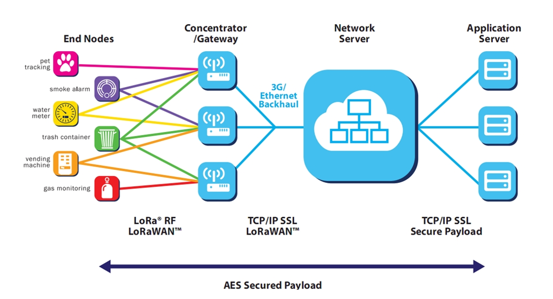 LoRaWAN はスター型トポロジを採用しています。端末デバイスはゲートウェイを介してネットワーク サーバーにデータを送信し、それをアプリケーション プラットフォームに転送します。
