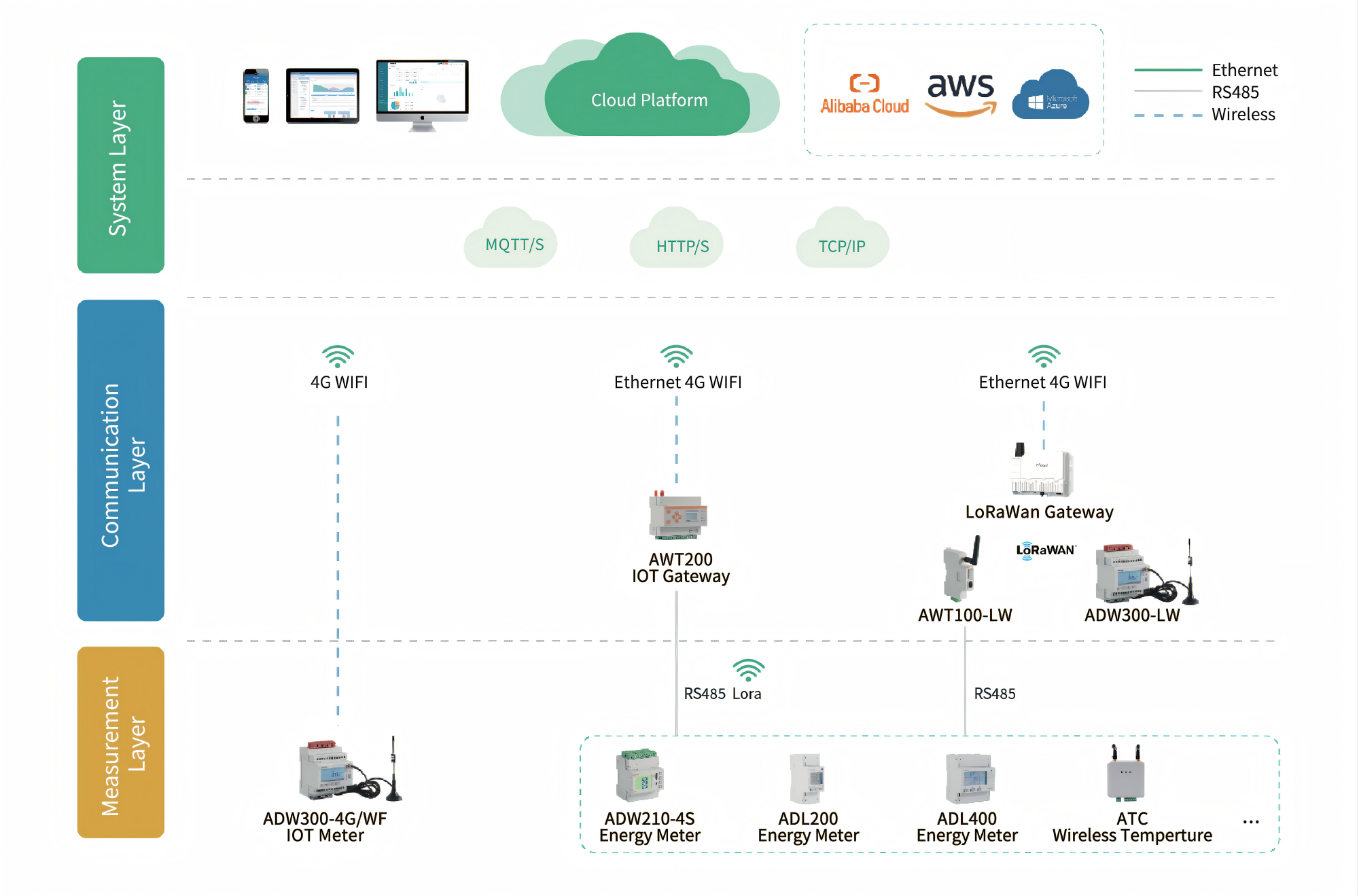 ADW300 は、IoT エネルギー管理システム、工場、学校、その他の商業環境または産業環境などのさまざまな環境で効率的なエネルギー管理を行うために設計された、多用途かつ高度なワイヤレス エネルギー メーターです。 4G、WiFi、LoRa、LoRaWAN などの複数の無線通信オプションを提供し、さまざまなアプリケーション要件を満たす柔軟で信頼性の高いデータ伝送を保証します。