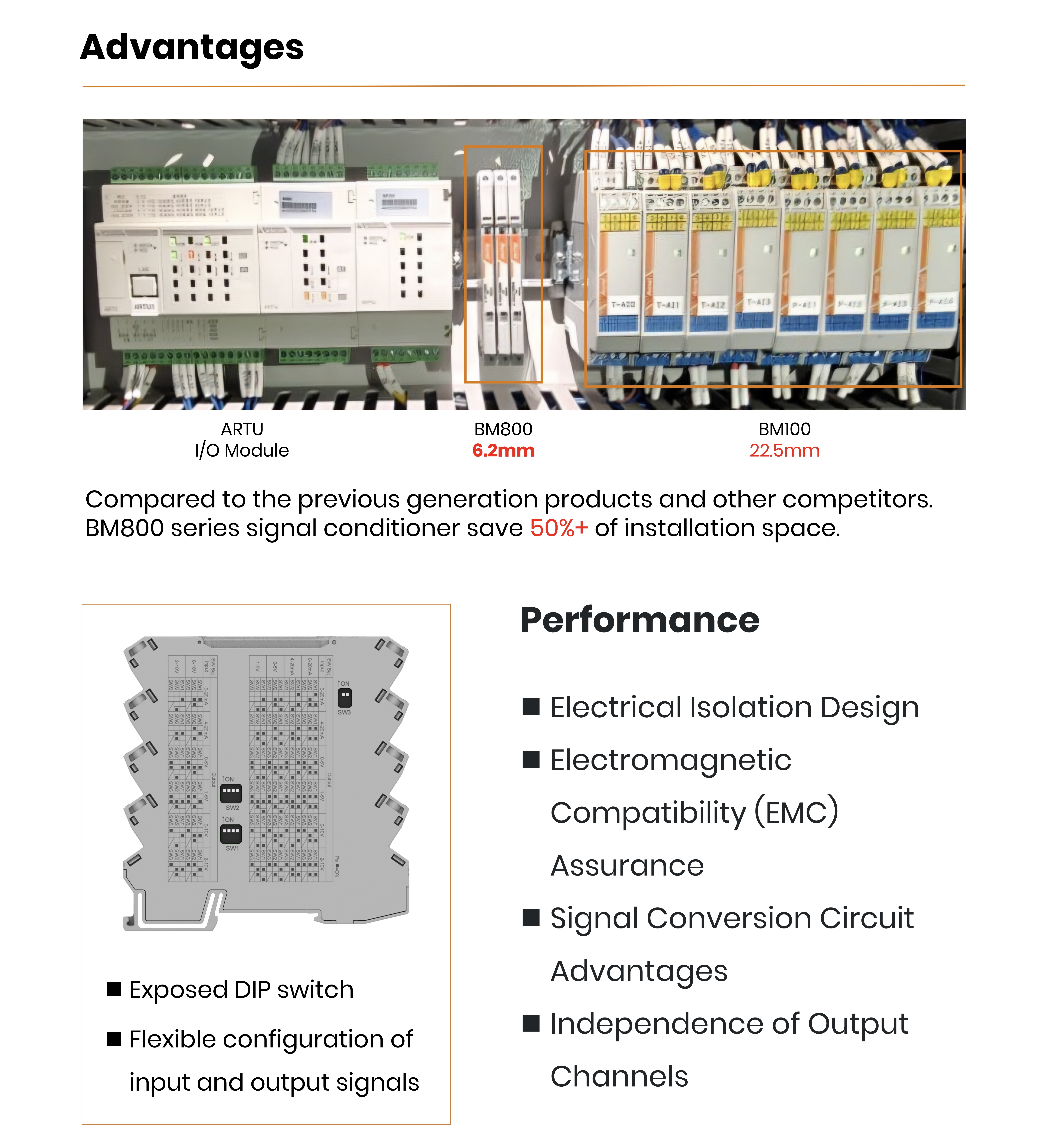 BM800 シリーズ シグナル コンディショナは、信号アイソレータ、信号コンバータ、信号トランスデューサとしても知られ、超薄型 6.2 mm 設計の高度な産業用信号調整デバイスで、設置スペースを 50% 以上節約します。 0.1%の精度、電磁両立性保証を誇り、電気的絶縁、信号変換回路の利点、独立した出力チャンネルなどの機能を備えています。 DIPスイッチにより柔軟な入出力信号構成が可能で、0/4~20mA、0/1~5Vなどの様々な信号を処理できます。また、温度ドリフト、応答時間、絶縁強度においても優れた性能を持っています。